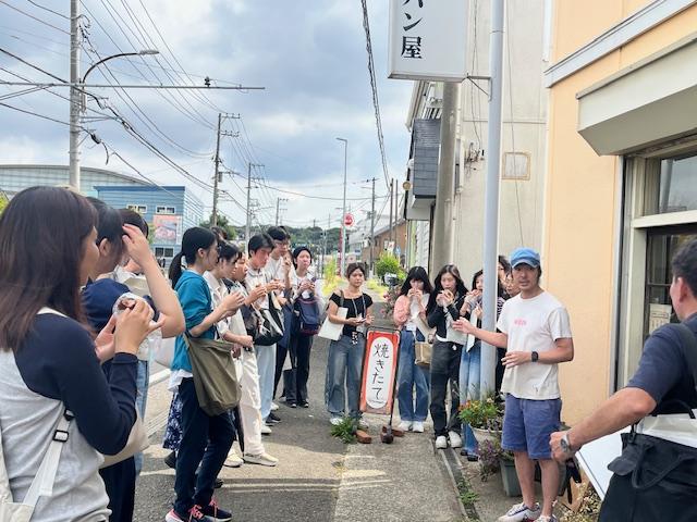 2025年9月19日(金)、若い世代に三浦市、横須賀市の魅力を感じていただき、関係人口となるとともに、将来の定住候補地としていただくよう「三浦半島に暮らすといかに美味しい毎日になるのか発見するバスツアー(以下、ツアー)」を実施しました。当協議会の構成団体である関東学院大学、横浜市立大学の学生16名が、三浦半島の暮らしを彩る個性的なパン事業者等(充麦さま、慈こうさま、法塔ベーカリーさま、ザクロさま、ブロートバウムさま)の代表者さまから三浦半島の食の魅力や自社製品の説明を受けました。参加した多数の学生から、三浦半島の魅力を